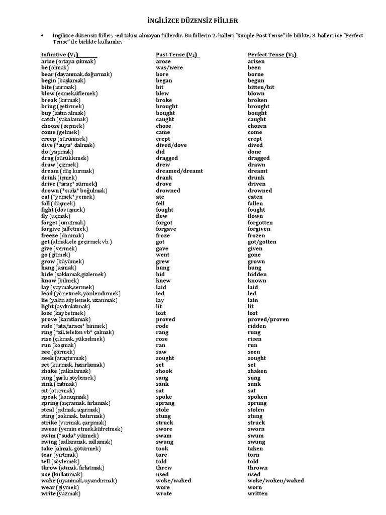 ingilizce duzensiz fiiller