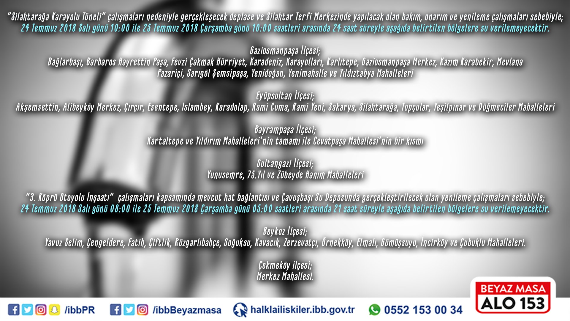 ibb beyaz masa on twitter silahtaraga karayolu tuneli ve 3 kopru otoyolu insaati calismalari kapsaminda gaziosmanpasa eyupsultan bayrampasa sultangazi beykoz ve cekmekoy ilcelerimizin bazi mahallelerinde su kesintisi yasanacaktir https t co